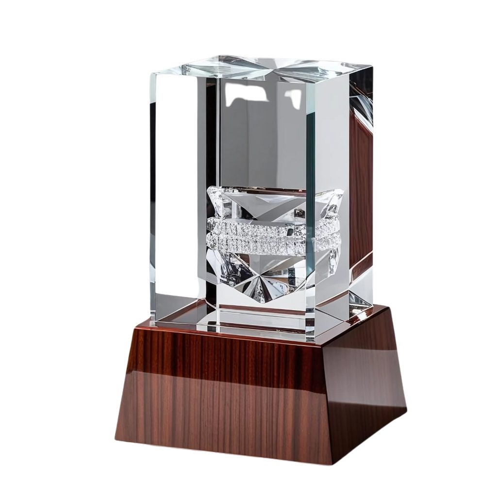 Crystal & wood trophy with a wooden base combine the sophistication and elegance of wooden base. This unique blend offers a striking contrast between the sparkling crystal and the richness of tones of wood, creating a timeless and distinguished award. The wooden base adds stability and a touch of classic style, making it ideal for corporate recognition, milestone achievements, or special commemorations. Customizable with engravings and logos, to place your orders reach out to us!